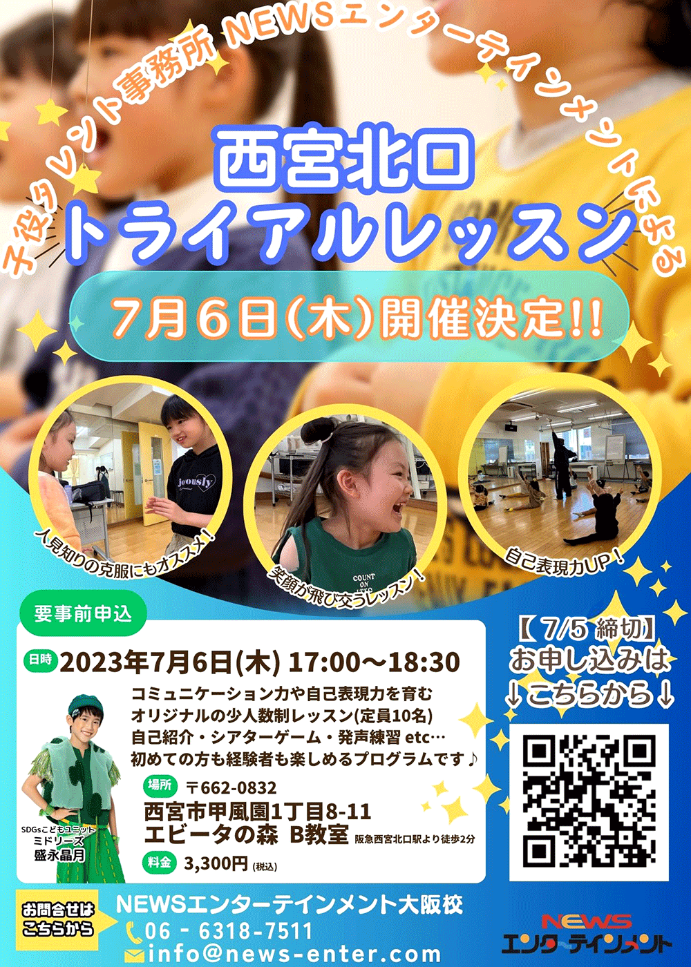 西宮北口にてNEWSエンターテインメントのトライアルレッスンの開催が決定いたしました!!