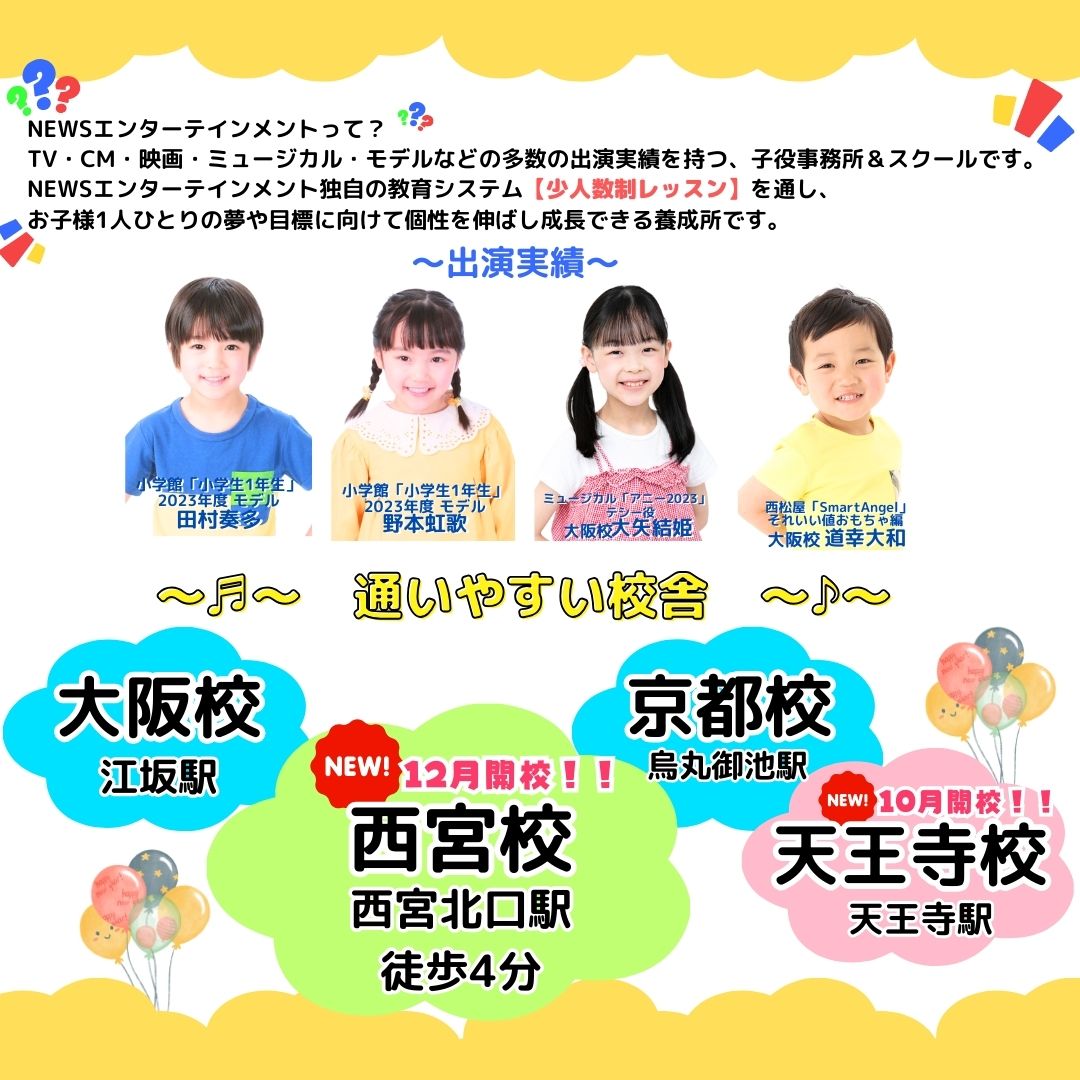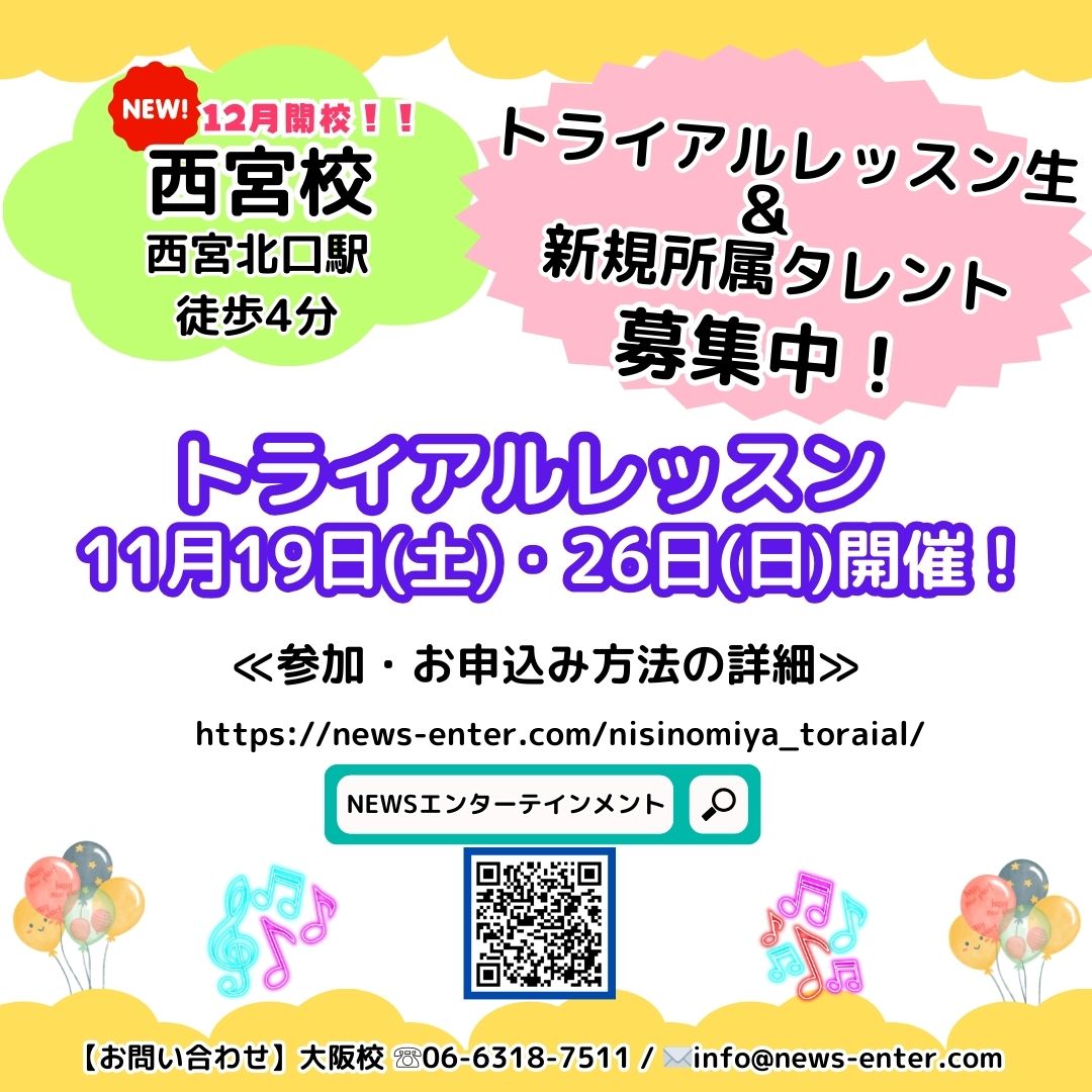 兵庫県の阪急西宮北口駅より徒歩4分の場所にNEWSエンターテインメント西宮校が12月に開校します!!