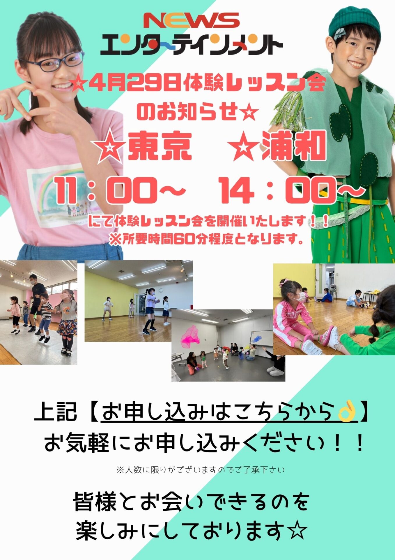トピックス 2024.04.19 🌟4月29日(月祝)体験レッスン会開催のお知らせ🌟 開催日:4月29日(月祝)時間:東京校11:00~11:30 浦和校14:00~14:30※レッスン時間含め所要時間60分程度となっております。持ち物:動きやすい恰好、お飲み物、室内履き(ご用意可能であればで大丈夫です)レッスン内容:エンターテインメント・コース 演技レッスン お気軽に、楽しんでいただける体験レッスン会となっております!🤩🕺🌈この機会に是非🌟 « 前の記事 トピックス 外部生も受講OK!🕺SummerSchool🎐お申し込み受け付け開始!! 2024.05.17 次の記事 » トピックス 2024年5月19日大宮北ハウジングステージにて無料写真撮影会&キッズフォトコンテスト開催決定!!! 2024.04.12